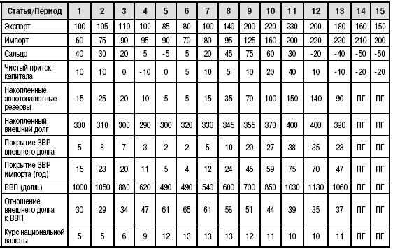 Логика у инвесторов следующая. Излишний приток валютных ресурсов позволяет прогнозировать как минимум стабильность национальной валюты страны-экспортера и рост внутренних цен, номинированных в том числе и в СКВ. Данная комбинация, несмотря на существенную инфляцию, приводит к увеличенной доходности в долларах США, повышению курса национальных компаний, деловой активности и др. Данные факторы еще больше способствуют притоку внешних портфельных инвестиций, которые иногда неискушенными политиками и экономистами трактуются как результат благоприятного экономического климата в стране. Наивные, как дети в возрасте до пяти лет. Но это, естественно, ошибочное мнение. Одновременно с притоком капитала увеличивается внешний долг государства, который в дальнейшем станет дополнительным негативным фактором для финансовой стабильности в долгосрочном плане. Упрощенно общую динамику ряда экономических и финансовых показателей страны – экспортера сырья можно выразить следующими данными (см. таблицу).