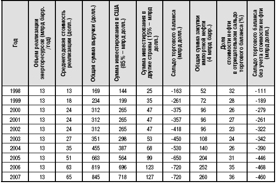 Для более глубокого понимания рассмотрим ситуацию с США. Общие потребление нефти составляет 7,3 млрд барр./год. Импорт 4 млрд барр./год. Себестоимость производства собственной нефти возьмем 10 долл./барр. Население 303 млн человек. За счет достижения счета текущих операций торгового партнера (экспортера нефти) нулевого значения, потребление импорта за счет снижения курса национальной валюты снижается. Соответственно, экспорт США также начинает снижаться. Граждане США привыкли жить хорошо и много потреблять импортной продукции. Соответственно, при прочих равных условиях у них возникает дефицит торгового баланса. Одновременно в экономике происходит стагнация и увеличивается безработица. Для стимулирования экономического развития образовался громадный дефицит бюджета. Что нужно сделать для нормализации ситуации? Увеличить объемы продаж (предприятия начнут работать, появится занятость вместе с налоговыми выплатами и т. д.) и сбалансировать торговый баланс за счет привлечения внешнего капитала, который также резко снижается, поскольку внешние инвесторы не располагают свободными средства для инвестирования (счет текущих операций близок к нулю или имеет отрицательное значение). Инвестиции для США можно высвободить из местной (экспортера сырья) экономики, но при этом придется идти на более глубокое сокращение импорта (девальвация или пошлины). Местные жители также привыкли жить хорошо, соответственно, сократить потребление могут, но не столь значительно. Если будет резкое падение доходов граждан, то возможна революция. В то же время сокращение потребление так же негативно сказывается на экономике США (снижение экспорта).