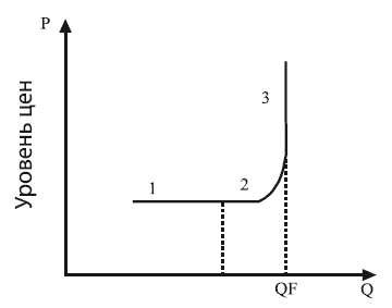 На первом отрезке общие расходы, т. е. сумма потребления, инвестиций, правительственных расходов до такой степени низки, что объем национального продукта сильно отстает от своего максимального уровня при полной занятости. Уровень безработицы высок, а значительная доля производственных мощностей предприятий простаивает. Предположим, что за счет денежной эмиссии увеличивается совокупный спрос. Тогда объем производства возрастет, уровень безработицы снизится, а уровень цен незначительно повысится.