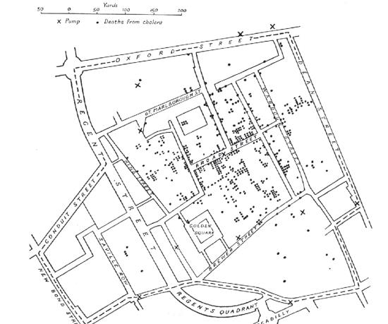 В 1854 году доктор Джон Сноу определил, что причиной холеры, скорее всего, являются загрязненные колодцы. Но в администрации ему не поверили. Сноу нарисовал схему района и точками пометил места, где люди умерли от холеры, а крестиками – колодцы. Так он выяснил, какие колодцы надо закрыть. Нехотя полиция убрала ручки у зараженных водокачек. В результате эпидемия была остановлена.