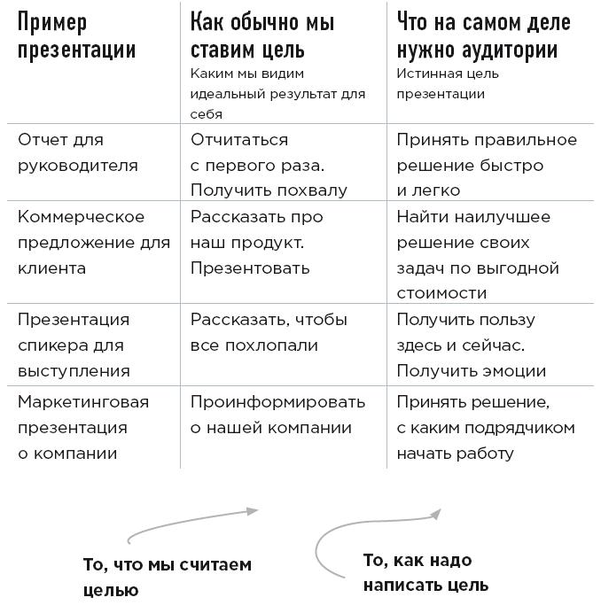 Мы формулируем цель как «отчитаться», «донести информацию», «рассказать». Но это сильно отличается от того, что нужно нашей аудитории.