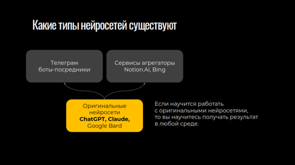 – Есть оригинальные нейросети – это те, которые используют свою собственную базу данных (датасет) и собственные вычислительные мощности для того, чтобы анализировать запросы и предоставленную пользователем информацию и затем выдавать результаты. К ним относятся ChatGPT, Claude, Google Bard (Gemini).