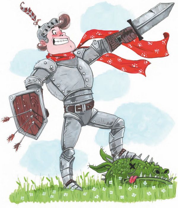 – Ура, вы дома! – обрадовался королевский гонец. – Сэр Бидон, страшные дела! В королевстве объявился огнедышащий дракон. Глазища красные, хвост зелёный. Уже кучу всего сжёг, а что не сжёг, прожевал и выплюнул! Король велел ему срочно голову отрубить.