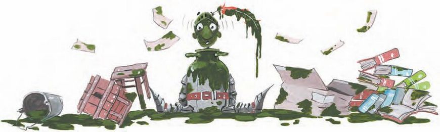 Ящик полетел в одну сторону, табуретка в другую, а ведро с зелёнкой – прямо на сэра Бидона! Кашляя и отплёвываясь, он на ощупь выбрался из кладовки…
