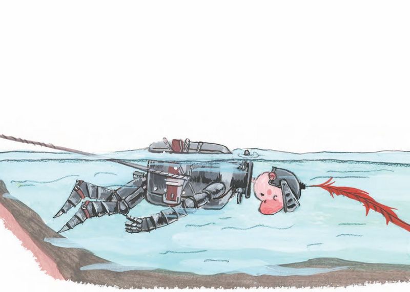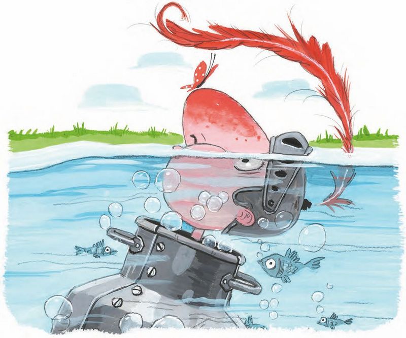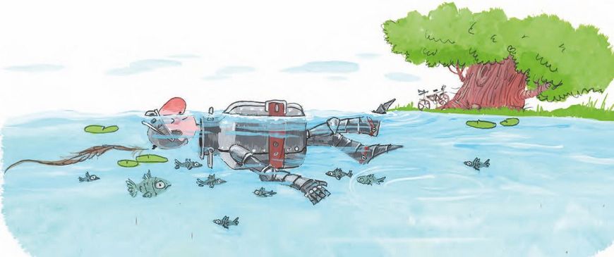Сэр Бидон повалялся полчасика в прохладной воде и уже собрался было вылезать, как вдруг… Оказалось, что он не может пошевелить ни рукой, ни ногой! Вдобавок под латы заплыли ужасно щекотные рыбки и стали щипать под мышками.