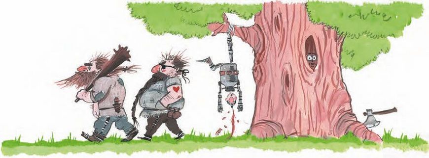 – Спаси-и-ите-е-е! На по-о-мо-о-щь! – кричал и кричал сэр Бидон. Уже и рыцарь охрип, и птицы все от страху попрятались, и волшебный дуб сто раз пожалел, что подножку поставил, – а помощь всё не шла и не шла. Наконец, когда солнце уже садилось, из лесной чащи показались два подозрительных типа…