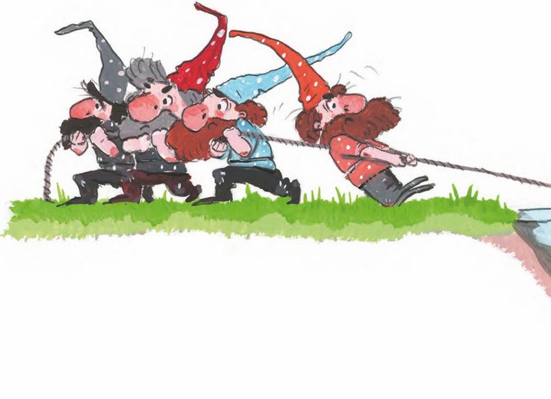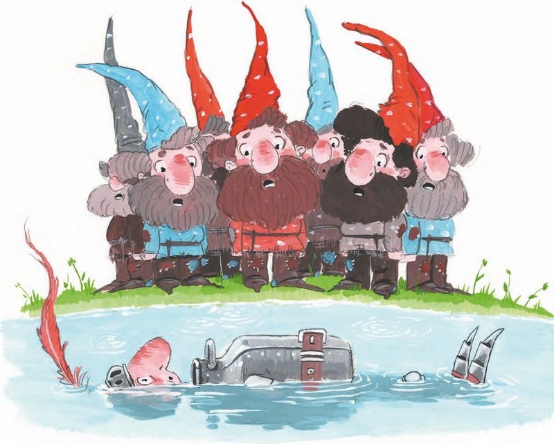 – Да кто вы вообще такие! – закричал сэр Бидон. Он так разозлился, что кое-как сумел повернуть голову… И увидел на берегу компанию ма-а-аленьких гномиков, ему по колено.