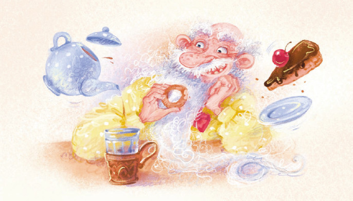 Но тут за столом начались настоящие чудеса. Чайник летал и подливал гостям чай, не роняя ни капельки мимо. Вишнёвый торт сам собой резался на куски и разлетался по тарелкам. Даже ложечки сами ныряли в чашки и размешивали сахар. «Вот это да-а-а!» – обомлела Клякса, разинув рот от удивления.
