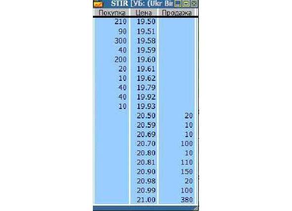 В левом столбце указаны объемы акций, которые участники рынка готовы купить по соответствующей цене (столбец посередине). Пишется общий объем всех заявок, иными словами цифра 200 может означать, что один трейдер хочет купить 120 акций, а другой – 80, либо один – 100 акций, другой – 60, а третий – 40, но все по цене 19,6 грн. за акцию. Может быть и такое, что один трейдер выставил заявку на 200 шт. В правом столбце – указаны объемы заявок на продажу, которые трейдеры готовы продать по соответствующей цене.