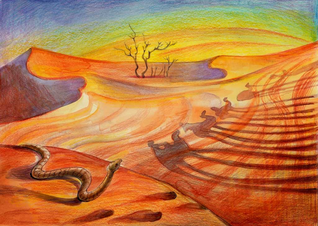 К утру ветер стих. И я вновь принялся за работу. Но другая беда – голод – начала подкрадываться ко мне. Часть еды, как и часть товара, что мы брали с собой в дорогу, была оставлена с не выдержавшими долгих скитаний падшими верблюдами. Всякий раз, снимая поклажу с умерших животных, мы пытались сохранить как можно больше дорогих вещей, пренебрегая целыми кулями со сладкими финиками, инжиром, орехами, лепёшками и прочей снедью. С какой жалостью я теперь вспоминал об этом! Весь оазис мой, как ты и сам видишь, – это крошечный островок из нескольких растений. Три дерева плодоносят фруктами, но не обильно и не всегда, и первый их сбор лишь немного освежил меня и только усилил мой голод. Запасы еды у меня почти иссякли.