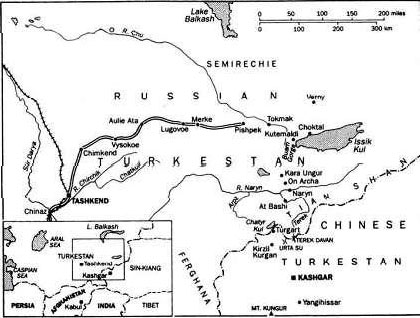 Замечания о маршруте передвижения П. С. Назарова. На небольшой и примитивной карте-схеме, имеющейся в книге «Hunted Through Central Asia», Oxford University Press, таковой маршрут в ряде мест не определён: внятно отмечена лишь дорога (ранее – почтовый тракт) от Ташкента до Пишпека (теперь это столица Кыргызстана г. Бишкек). У читателя может сложиться впечатление, что таким образом указан, по крайней мере, один из участков пути бегства Назарова «от ленинской секретной полиции». Но это не совсем так. Очевидно, что из соображений собственной безопасности беглец был вынужден, придерживаясь общего выбранного им направления сначала в Семиречье, а затем в Кашгарию, делать «фланговые манёвры», т. е. пользоваться второстепенными дорогами, горными тропами и даже полным бездорожьем. Имеющиеся в книге сведения о некоторых участках пути Назарова, особенно от Ташкента до почтового тракта Чимкент-Бишкек, скудны, однако этот район Западного Тянь-Шаня во многих отношениях очень интересен и переводчику он отчасти знаком. Предпринята попытка отследить некоторые нюансы пути Назарова по тексту повествования с использованием более подробных географических карт. Соответствующий материал, чтобы не задерживать здесь внимание читателя, помещен в Приложении.