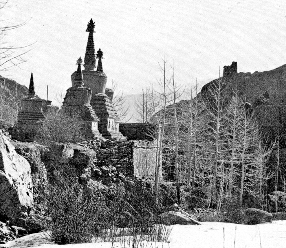 При впадении Нубры в Шайок, мы взяли вправо, и здесь сразу же началось наше восхождение на перевал Кардонг-ла, то есть через первый хребет Гималаев на пути в долину Инда. Внизу ущелье сплошь заросло деревьями и кустарниками, средь коих я смог различить несколько огромных тамарисков со стволами толщиной до ⅓ метра. Езда верхом по этому совершенно дикому лесу доставила мне истинное наслаждение. Но чем выше мы поднимались, тем более редел лес, деревья тончали и становились ниже, речной поток свелся к простому ручейку, и там, где дорога свернула в боковое ущелье, мы снова оказались в альпийской зоне. Миновали руины какого-то старого здания вроде караван-сарая, ряд старых чортенов и вышли на плоскую возвышенность, где расположилась деревня Кардонг. Под ней простиралась глубокая долина с террасами полей ячменя и трав. Ниже паслись яки, сверху похожие на чёрных муравьев. Вдалеке приютился монастырь.