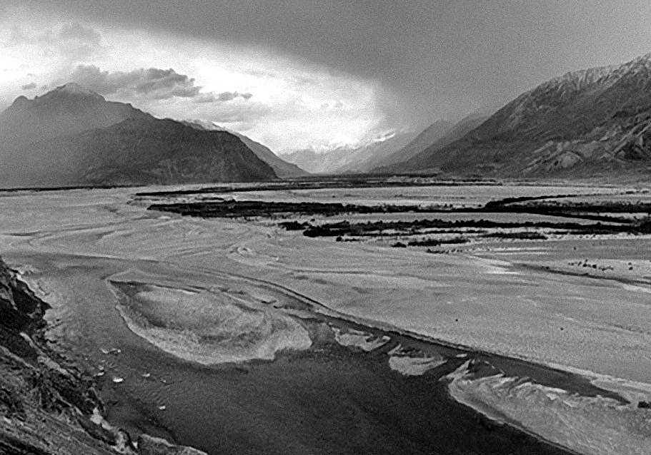 Неподалёку от деревни Тагар Нубра впадает в реку Шайок, которую мы видели ранее с перевала Сассер-ла. Шайок огибает массив Сассер и течет с востока на запад, в направлении гор Балтистана. Зимой, в межень, она замерзает, и по ней можно проехать, минуя Сассер-ла, Караул-Даван и Нубру. Долина реки широкая, выложена гравием и песком, который местами образует дюны и барханы, в иных местах утопает в зарослях шиповника и тамариска, достигающего здесь размеров больших деревьев; есть болотистые участки и деревни, где поля орошаются арыками. Одну из таких деревень мы проехали в полдень, её живописные улицы пролегали в тени огромных мелколистных ив. Здесь же появились первые деревья карагача (разновидность вяза), каковые я видел ещё в поселке Кёк Яр. Белые чортены высились как сторожевые башни.