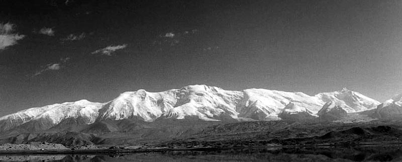 С равнины Кашгара эта гигантская стена высотой 5500-6000 м, простертая вдоль меридиана, хорошо видна. Только в двух-трёх местах по узким ущельям путешественник может пройти сквозь неё на пути между Кашгаром и Памирским плато. На фотографиях, приложенных к работе К.П. Скрина (Chinese Central Asia, by С.P. Skrine: Methuen), этот гребень изображен во всех деталях.