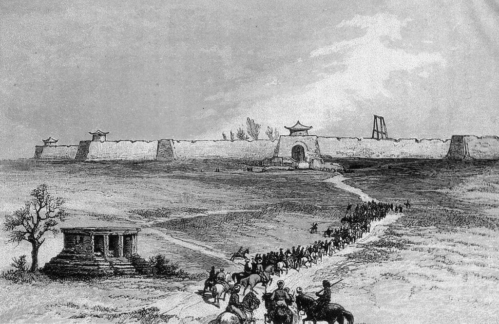 На противоположном берегу реки характер местности стал меняться. Снова видны были высокие деревья и зеленеющие поля с различными культурами, но почва стала беднее, и сувои ползучего песка то и дело пересекали дорогу. Когда до села Каргалык194 оставалось с дюжину вёрст, я остановился в деревушке отдохнуть и выпить чаю. Дорога вела дальше по тенистым аллеям, средь полей и садов, и примерно на полпути я вновь увидел натянутую поперёк дороги широкую полосу красной материи с надписью на китайском языке. Вкруг стояли пёстрые шатры, солдаты, музыканты, префект Каргалыкского уезда со штатом и горожане, местная «знать», дабы почтить явление нового амбаня.
