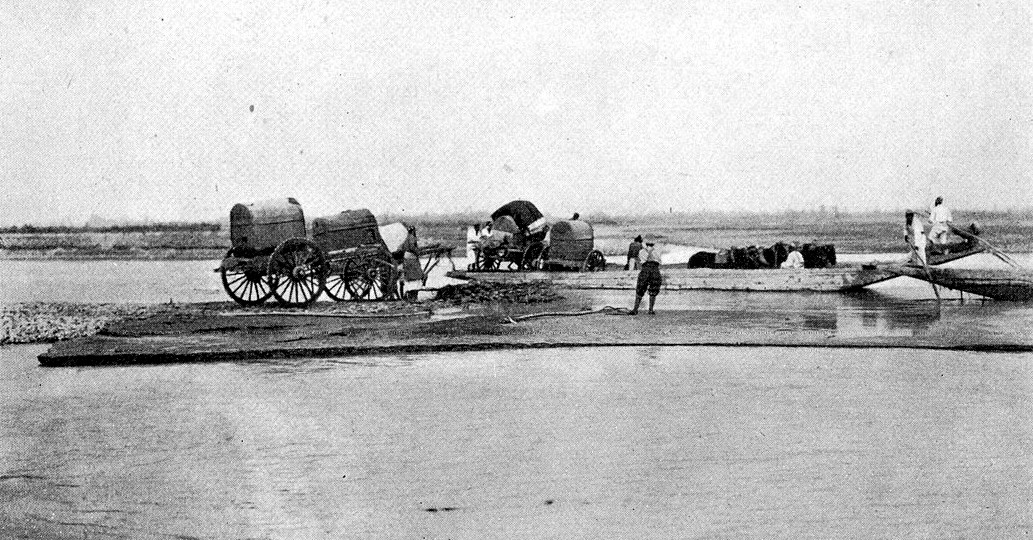 Дорога шла по возделанной земле в тени деревьев, через поля риса, сорго и хлопка, по мостам через раздвоившееся лоно реки Яркенд и, примерно через шесть вёрст вывела на широкую гравийную пойму, где река разбилась на множество рукавов с островками, поросшими кустарником. Река приняла характерный вид горного потока, что несет вниз массу песка и гравия и, разливаясь широкими потоками на относительно ровной местности, постоянно меняет очертания своего русла. В Туркестане реки относятся к тому же типу, что и По в Италии. Некоторые рукава легко преодолевались нашим караваном вброд, но другие приходилось пересекать на плотах, похожих на плоскодонные баржи с приподнятыми бортами; на них лошади, привыкшие к переправам такого рода, запрыгивали довольно лихо. Людям, занятым на переправе, так или иначе удавалось затащить на борт тяжело груженую телегу с огромными двухметровыми колесами.
