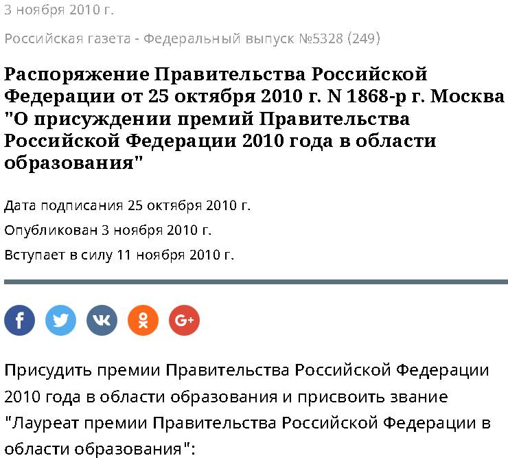 3-го ноября 2010 года в российской газете было опубликовано Распоряжение Правительства РФ (https://rg.ru/2010/11/03/premii-dok.html) (рис. 1.2)