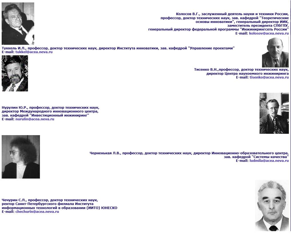 1. Колосов Владимир Григорьевич (1935–2004 г.г.), заслуженный деятель науки и техники России, профессор, доктор технических наук, зав. кафедрой «Теоретические основы инноватики», генеральный директор ИИК, заместитель президента СПбГПУ, генеральный директор федеральной программы «Инжинирингсеть России».