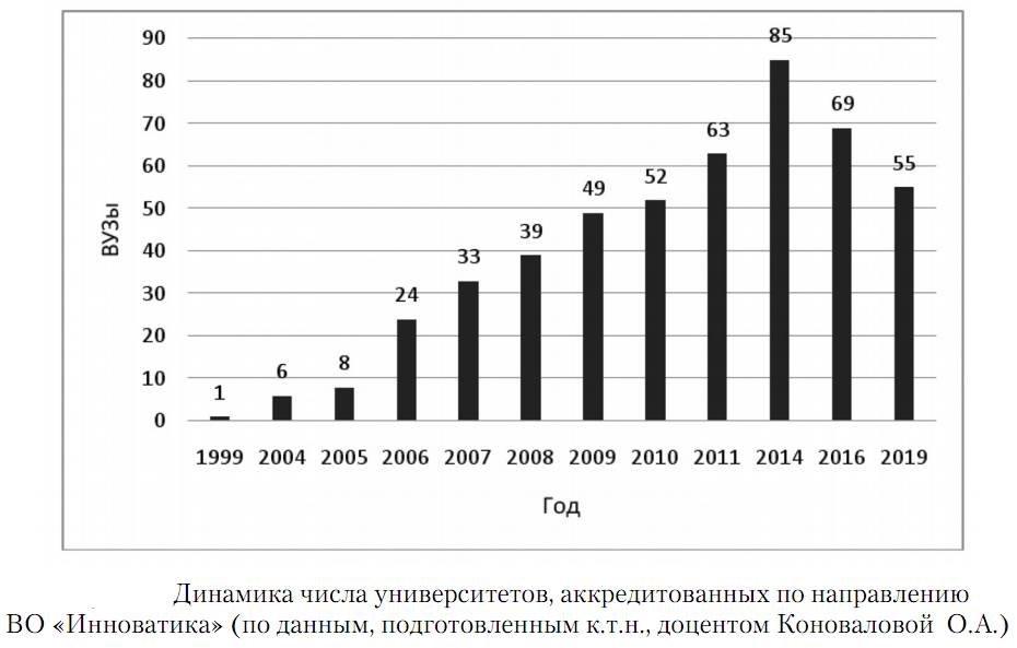 Динамика этого процесса подтверждает его успешность: если в 1999 г. образовательная программа реализовывалась лишь в одном университете, то в 2003 г. число вузов, готовивших специалистов в области инноватики, достигло 6, в 2006 г. – 24, а в 2009 г. – 49. На сегодняшний день – их не менее 85.