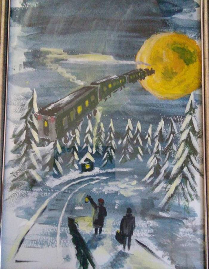 Полустанок «засыпанный шапкой снегов», луна, поезд на небо, который отправился в полночь, железнодорожник и я (человек с чемоданом), который то ли опоздал, то ли не решился сесть. Рисунок получился небольшой, но как-то сразу полегчало.
