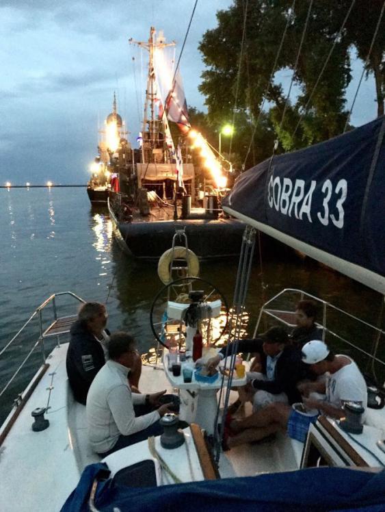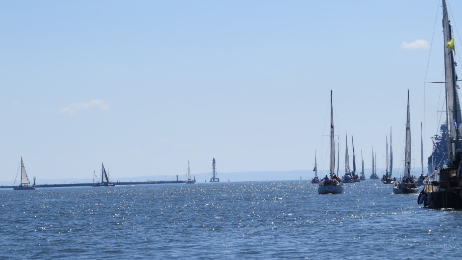 Успели выйти из канала как раз к началу нашего (яхт) прохождения вдоль восторженных зрителей, потом, развернувшись у выхода в море, вдоль боевых кораблей, обратно в залив.
