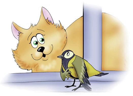 А скоро появилось яркое солнышко. От его горячих лучей снег растаял, на земле появилась трава, на деревьях набухли почки – вот-вот покажутся зелёные листочки. Раму окна раскрыли. И весенним тёплым ветерком обдало всю комнату. Мурлыка прыгнула на подоконник, а там сидит синичка и поёт:
