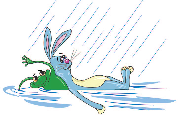 Зайчик вышел погулять. Гулял, гулял и по пути перепрыгнул ручеек. И тут вдруг пошел дождь. Зайчик хотел обратно вернуться, да ручеек превратился в речку. Заволновался, заметался Зайчик: «Так можно и домой не попасть!».