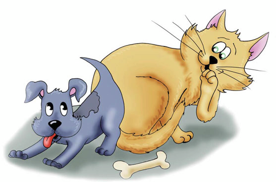 Однажды пёс Полкан долго не появлялся во дворе. Его друзья собачка Жучка и кошка Мурлыка, увидев его, спрашивают: