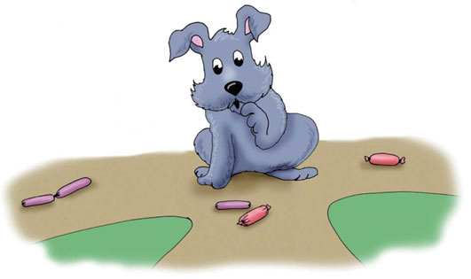 Щенок ничего не понимает. Мама думала, думала, как научить его, и догадалась, как это сделать. Взяла мисочку с разной вкуснятиной. Одну сосиску отнесла на тропинку, идущую налево, и говорит ему: