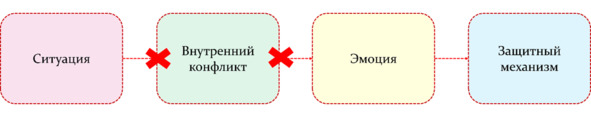 – Внутренний конфликт. Внутренний конфликт – это самый сложный пункт в нашей модели, который мы будем разбирать более подробно далее. На данный момент скажем, что внутренний конфликт – это то внутренне противоречивое содержание психики, которое активируется в данной ситуации и которое провоцирует появление тех или иных чувств. Внутренние конфликты могут быть разных видов. Например, девушка при встрече с мужчиной (ситуация) может начать беспричинно бояться его; это связано с тем, что когда-то к ней приставал ее отец, образ которого она теперь проецирует на данного и на других мужчин. Таким образом у данной девушки проявляются противоречивые стремления: с одной стороны, тяга к общению с мужчинами (потребность в отношениях), а с другой стороны страх перед ними (потребность в безопасности), который мешает ей реализовать ее потребность. Как правило, внутреннее содержание конфликта вытесняется (по многим причинам, в том числе в виду банального отвлечения внимания на текущую ситуацию), а в нашем примере девушка может просто вытеснить образ отца, причем сделать это она способна с различной степенью адаптивности. Например, она может начать боятся молодого человека, не понимания почему, но осознавая, что ее чувства неадекватны в данной ситуации. Но она также может начать бояться его, затем придумывая объяснения собственному страху (рационализируя его), заявляя, что у этого мужчины «угрюмый взгляд» или что «неразговорчивые мужчины таят в себе опасность». Это лишь один из примеров внутреннего конфликта, связанный с прошлым опытом. Однако, конфликт может быть и актуальным, например, когда индивид заявляет, что «часто злится на свою жену», хотя в процессе обсуждения оказывается, что жена дает вполне весомые поводы для того, чтобы на нее злиться. Отсюда мы можем заподозрить, что существует вторая часть данного конфликта, состоящая в убеждении «мне нельзя злиться на жену» обычно идущем с каким-то дополнением в стиле «если я буду злиться, то семья развалится» или «взрослый человек не должен ни на кого злиться». В данном случае мы наблюдаем конфликт второго рода – конфликт отношения к самому себе и своим чувствам. Такой конфликт будет принципиально менять ход терапии, так как, если в первом случае наша задача – это поменять неадаптивную реакцию субъекта на ситуацию, то во втором – помочь человеку принять собственную реакцию, так как она является адаптивной и кажется ненормальной только ему самому.