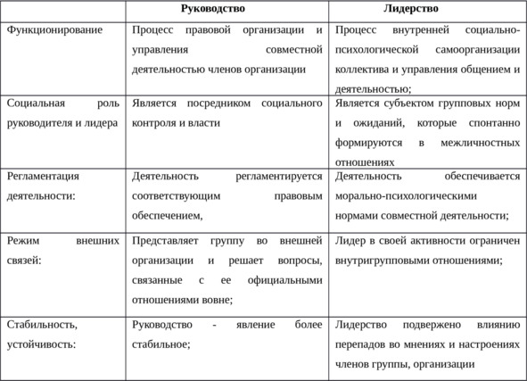 В 1971 г. была опубликована работа Б. Д. Парыгина, где он выделил ряд различий лидерства и руководства, которые в последующем официально закрепились в советской науке. Позже исследователи активно предпринимали попытки уточнить и противопоставить эти понятия. Как правило, в первом случае выделялось естественное, свободное, неформальное начало в противоположность официальному во втором. Так, А. А. Урбанович выделяет следующие различия между руководством и лидерством (Таблица 2.3).