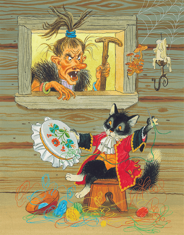 Отошла Баба-Яга от окошка… Смотрит девочка, а по горнице кот ходит. Сам чёрный, глаза жёлтые, хвост трубой. Ходит, жмурится, усищами шевелит, когтищами по половицам поскрёбывает.