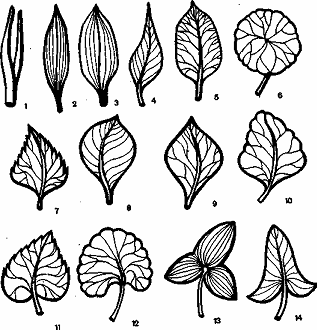 1 – игольчатая; 2 – линейная; 3 – продолговатая; 4 – ланцетная; 5 – овальная; 6 – округлая; 7 – яйцевидная; 8 – обратно-яйцевидная; 9 – ромбическая; 10 – лопатчатая; 11 – сердцевидно-яйцевидная; 12 – почковидная; 13 – стреловидная; 14 – копьевидная.