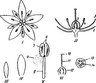 I – чашечка с пятью чашелистиками, пестик с пятью лепестками, десять тычинок и пестик; II – продольное сечение, показывающее взаимоотношения частей: 1 – цветоложе; 2 – чашечка; 3 – венчик; 4 – тычинка; 5 – пестик с завязью; III – чашелистик; IV – лепесток; V – тычинка: 6 – пыльник; 7 – мешочек с пыльцой; 8 – пыльца; 9 – нить; VI – пестик: 10 – рыльце; 11 – столбик; 12 – завязь; VII – поперечное сечение завязи: 13 – гнезда завязи; 14 – семяпочка.