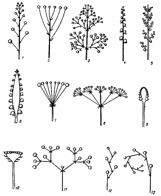 1 – кисть; 2 – щиток; 3 – метелка; 4 – простой колос; 5 – сложный колос; 6 – початок; 7 – простой зонтик; 8 – сложный зонтик; 9 – головка; 10 – корзинка; 11 – развилина; 12 – извилина; 13 – завиток.