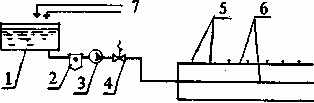 1 – резервуар; 2 – фильтр; 3 – насос; 4 – магнитный клапан; 5 – капельница; 6 – пластмассовый разводящий трубопровод; 7 – вода.
