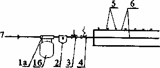 1 – дозатор (а – головка, б – резервуар); 3 – регулятор давления; 4 – магнитный клапан; 5 – капельница; 6 – пластмассовый разводящий трубопровод; 7 – вода.