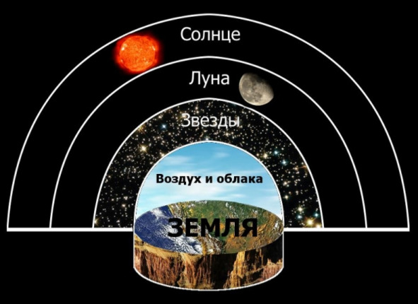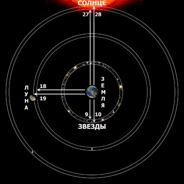 В самом близком кольце, где огня немного, имеются небольшие отверстия – звезды. Во втором кольце с более сильным огнем находится одно большое отверстие – Луна. Оно может частично или полностью перекрываться, что объясняет смену лунных фаз и затмения. В самом дальнем кольце находится Солнце.