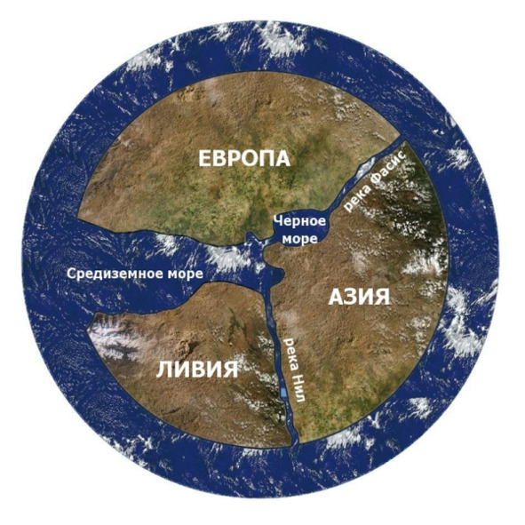 Европа была ограничена на юге Средиземным морем и была отделена от Азии Черным морем и озером Мэотис, а на востоке – либо рекой Фасис (ныне – Риони) либо рекой Танаис. В средиземное море впадала река Нил, отделявшая Ливию (по сути весь Африканский континент, названный в честь наиболее известной на тот момент страны) от Азии.