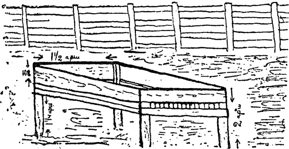 Над этой канавой устанавливается бездонный ящик с приспособлением для накладывания рам. Яму эту набивают свежим, не перегорелым навозом до самого верха. Набивать надо так: если навоз сильно соломистый, то его хорошенько уплотняют ногами. Набивают канаву навозом до самого верха, потому что когда навоз разгорится, он даст сильную осадку.