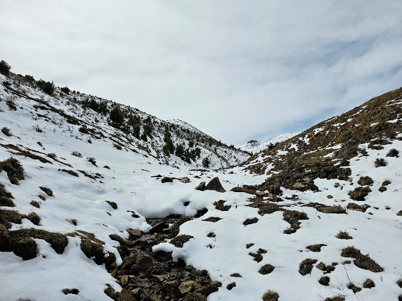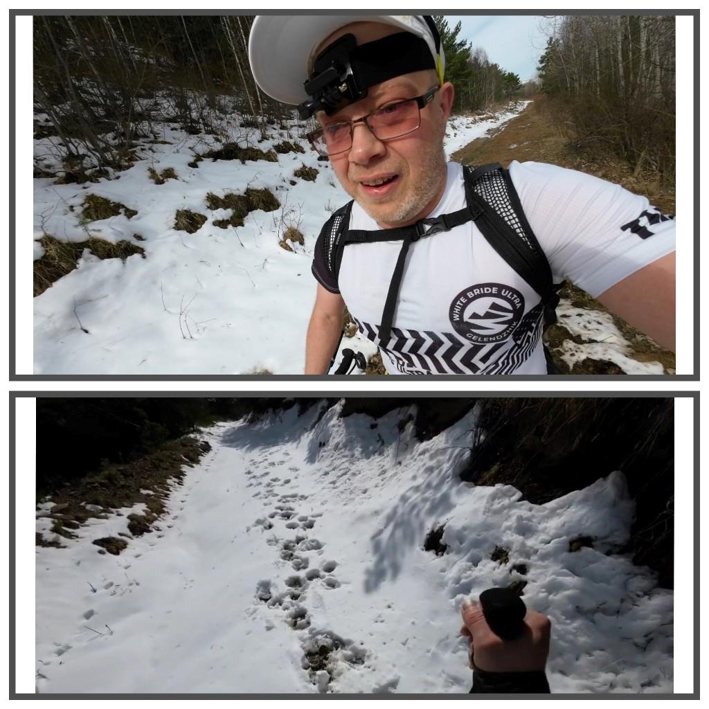 Снег на тропе появился примерно на высоте 1800 метров на тропе. Несколько сантиметров белоснежного покрывала не столь критичны для скорости, но кроссовки довольно быстро промокли. Уклон постоянно менялся. На более крутом подключал в работу палки.