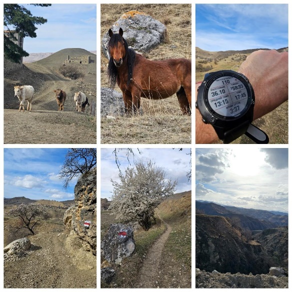 Пробегал мимо одиноких домиков, цветущих деревьев, лошадей и овец. Останавливался, фотографировал горные виды и мчал дальше. Красно-белая разметка Кавказской тропы всё глубже залегала в сердце. Иногда терял её, мог обрадоваться спуску и пронестись вперёд метров на двести, четыреста, а потом по треку в часах увидев, что сбился, вернуться.