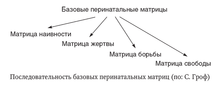 Особое значение в развитии перинатальной психологии имеет теоретическая база одного из основателей трансперсональной психологии С. Грофа. Выведенная им теория базовых перинатальных матриц (БПМ) позволила рассмотреть весь процесс переживания беременности, родов и послеродового периода с позиции ощущений и переживаний ребенка. Перинатальный процесс тесно связан с биологическим рождением, но также включает в себя важные психологические, философские и духовные измерения. Эти матрицы имеют фиксированные связи с определенными группами воспоминаний из жизни человека и представляют собой динамические управляющие системы, несущие собственное специфическое содержание биологического и духовного характера. Биологический аспект перинатальной памяти состоит из конкретных и довольно реалистических переживаний, связанных с индивидуальными стадиями родовой деятельности. Кроме того, в каждом шаге биологического рождения присутствует специфическая духовная составляющая (см. рисунок).