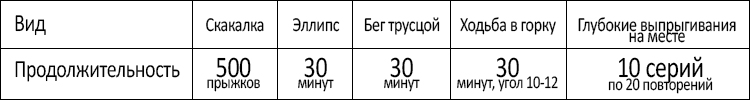 Данные тренировки помогут укрепить сердечно – сосудистую систему, способствуют повышению выносливости и эффективному расходу лишних калорий. В данной программе они выносятся в отдельный день по 1 часу, но также и перед началом тренировки сессией в 30 минут.