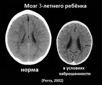 На рисунке выше можно видеть сравнение мозга трёхлетних детей: нормального слева и растущего в условиях сенсорного дефицита справа. Можно видеть разницу не только в структуре и в размерах мозга, но и в размерах черепной коробки – да, голова заброшенного ребёнка ощутимо меньше головы нормального. Меньше и всё его тело.