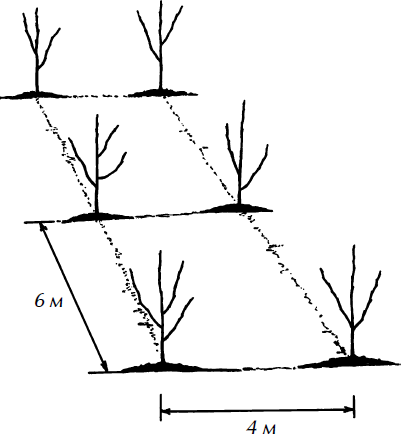 При посадке в несколько рядов яблони принято размещать на расстоянии 6 × 4 м друг от друга; при однорядной посадке расстояние между деревьями можно сократить до 3 м