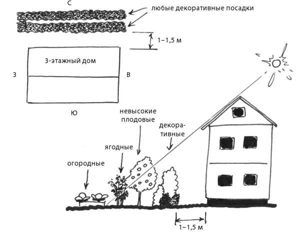 Рис. 3. Положение с теневой северной стороны построек: на расстоянии 1–1,5 м от стены уже можно сажать все декоративные растения
