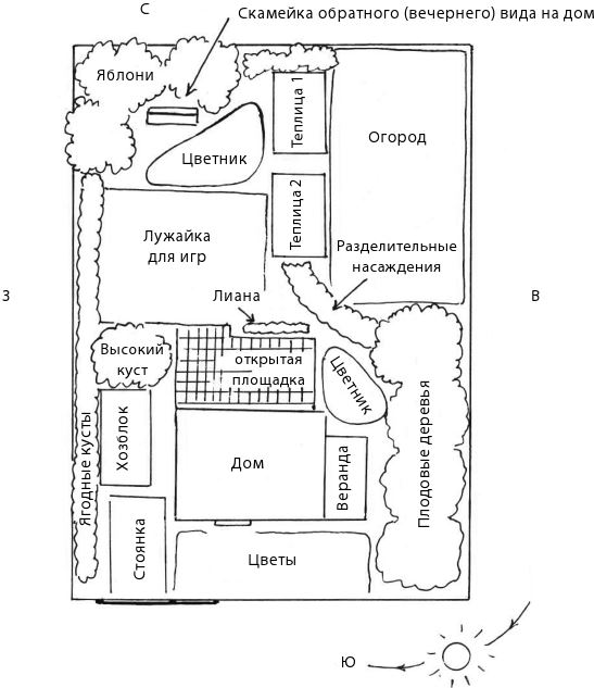 В обоих случаях вход на участок расположен с южной стороны, а главная точка обзора – одновременно из кухни и с открытой площадки для застолий (подразумевается, что лужайка для игр детей должна быть все время на виду у взрослых).