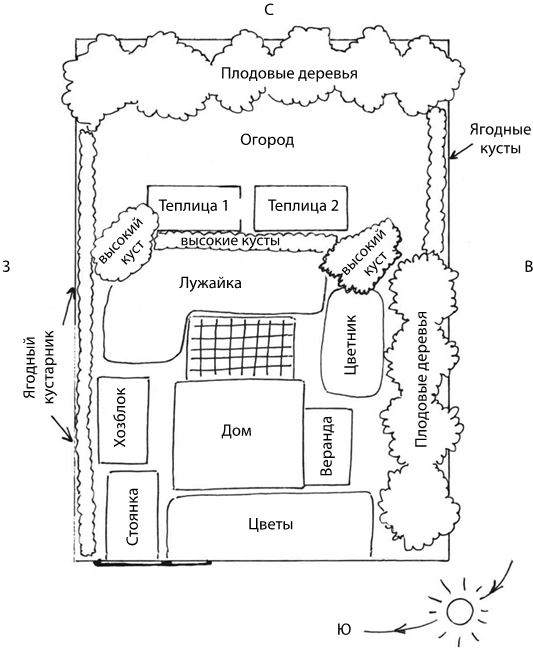 Еще интересен пример обособления огорода и плодового сада. Как их спрятать и при этом обеспечить полноценным солнечным освещением? Рассмотрим два варианта (рис. 5, 6).