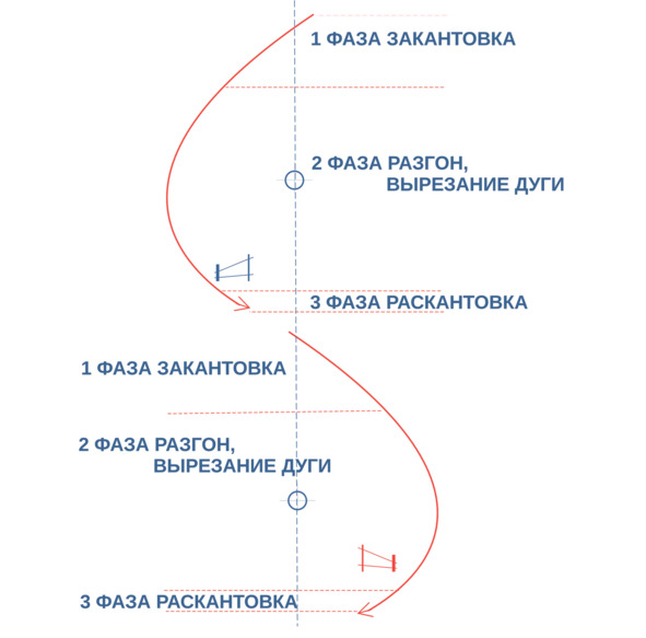 3) выход из поворота, раскантовка для перехода в новый рабочий кант.